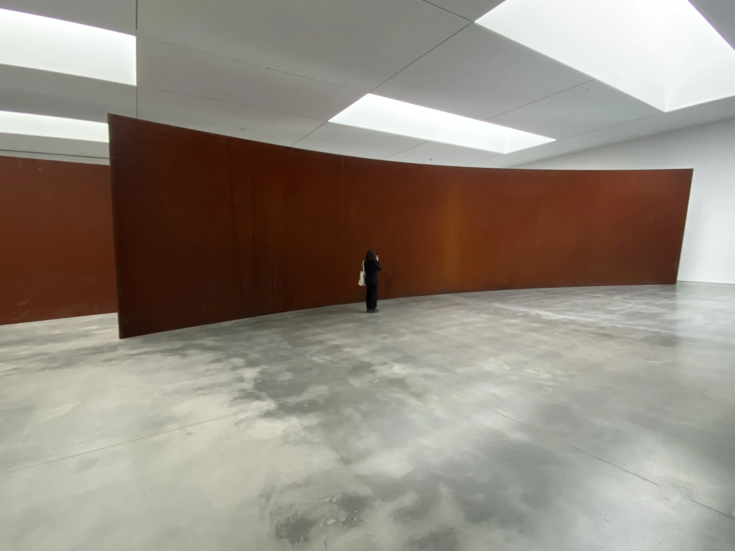 Moving through Running Arcs, the viewer enters a nonlinear spatial sequence carved by steel. Wide apertures narrow into compressed passages, and then open again. The curved colossal steel sculpture disrupts ordinary perceptions of linearity. There is an ineffable spiritual feeling to the space embraced by the Running Arcs. At the Gagosian, the stark contrasts of white walls, concrete floors, relative emptiness, and natural light bathing the sculpture evoked the sense of a holy space, accentuated by the knowledge of the artist’s death in 2024.